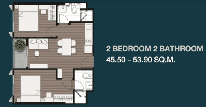 兩房兩衛:45.50~53.90平方公尺(約13.76~16.30坪)